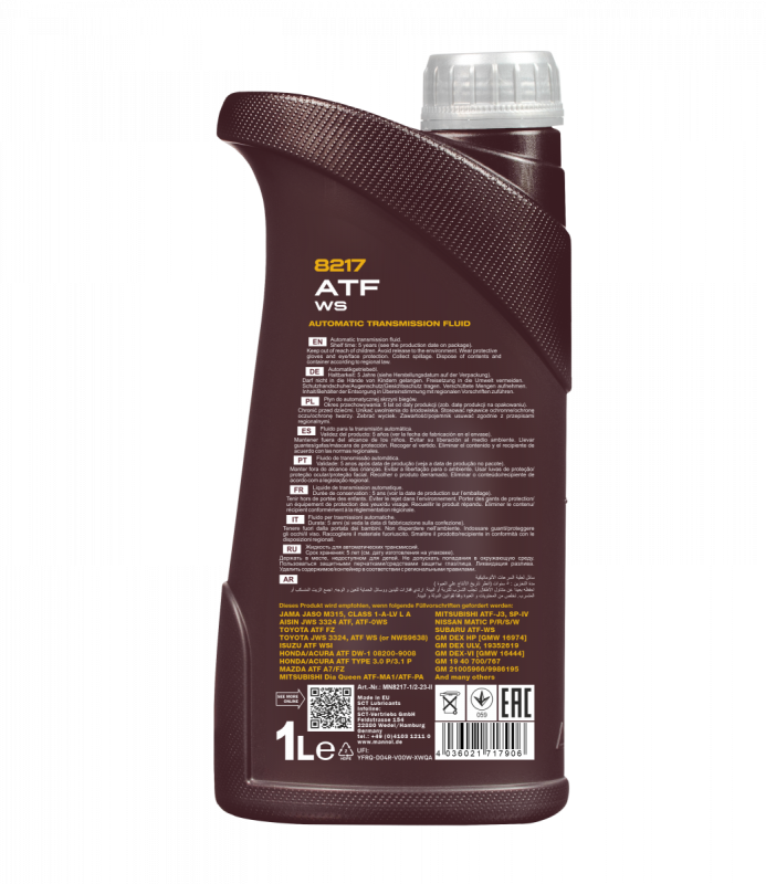 | Спецификация OEM | TOYOTA ATF WS Lifetime; TOYOTA 08886-02303; TOYOTA 08886-02305; TOYOTA 08886-80803; TOYOTA 08886-80807; TOYOTA 08886-81210; NWS-9638; NWS-9638 T5; JWS 3324; GM 88863400; GM 401; CHRYSLER ATF 4; MAN 339 Type Z-1 |