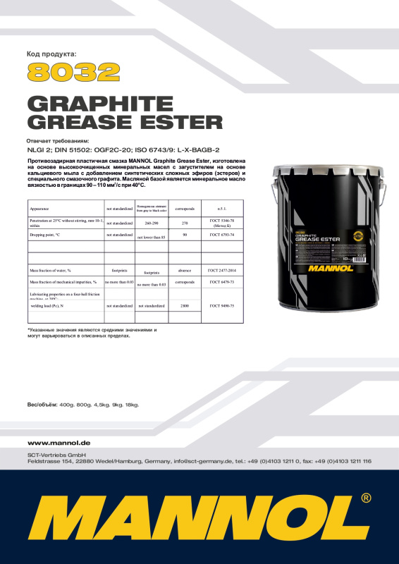Противозадирная пластичная смазка MANNOL Graphite Grease Ester, изготовлена на основе высокоочищенных минеральных масел с загустителем на основе кальциевого мыла с добавлением си м синтетических сложных э ых эфиров (эстеров) и специального смазочного графита. Масляной базой является минеральное масло вязкостью в границах 90 - 110 мм /с при 40°С.