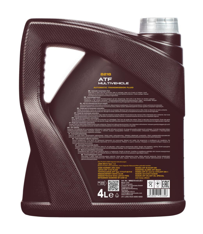 | Спецификация OEM | AISIN WARNER JWS 3309; VOLKSWAGEN G 052 025-A2; VOLKSWAGEN G 052 162-A1; VOLKSWAGEN G 052 990-A1; VOLKSWAGEN G 052 990-A2; VOLKSWAGEN G 055 025-A1; VOLKSWAGEN G 055 025-A2; BMW 83 22 0 403 248; BMW 83 22 2 163 514; BMW 83 22 9 407 765 (LA 2634); BMW 83 22 9 407 807; BMW 7045E (3 Series); BMW ETL-8072B (5 Series); BMW LT71141 (ZF 5 Speed); CHRYSLER ATF+3; CHRYSLER ATF+4; DAIHATSU ALUMIX ATF MULTI; FORD Mercon V; FORD Mercon SP; FORD Mercon LV; FORD Mercon ATF Type F; FORD XT-8-QMM5 [FRN5]; GM Dexron II; GM Dexron II D; GM Dexron II E; GM Dexron III F; GM Dexron III G; GM Dexron III H; HONDA ATF-Z1 (not for CVT); HONDA ATF DW-1; HYUNDAI ATF SP-II; HYUNDAI ATF SP-III; IDEMITSU K17-Jaguar X Type 2001-2005; INFINITI Matic D; INFINITI Matic J; INFINITI Matic K; JATCO ATF 3100 PL085; KIA ATF-SP-II; KIA ATF-SP-III; MAN 339 F; MAN 339 V1; MAN 339 V2; MAN 339 Z1; MAN 339 Z2; MAZDA ATF M-III; MAZDA ATF M-V; MB 236.1; MB 236.2; MB 236.3; MB 236.5; MB 236.6 |